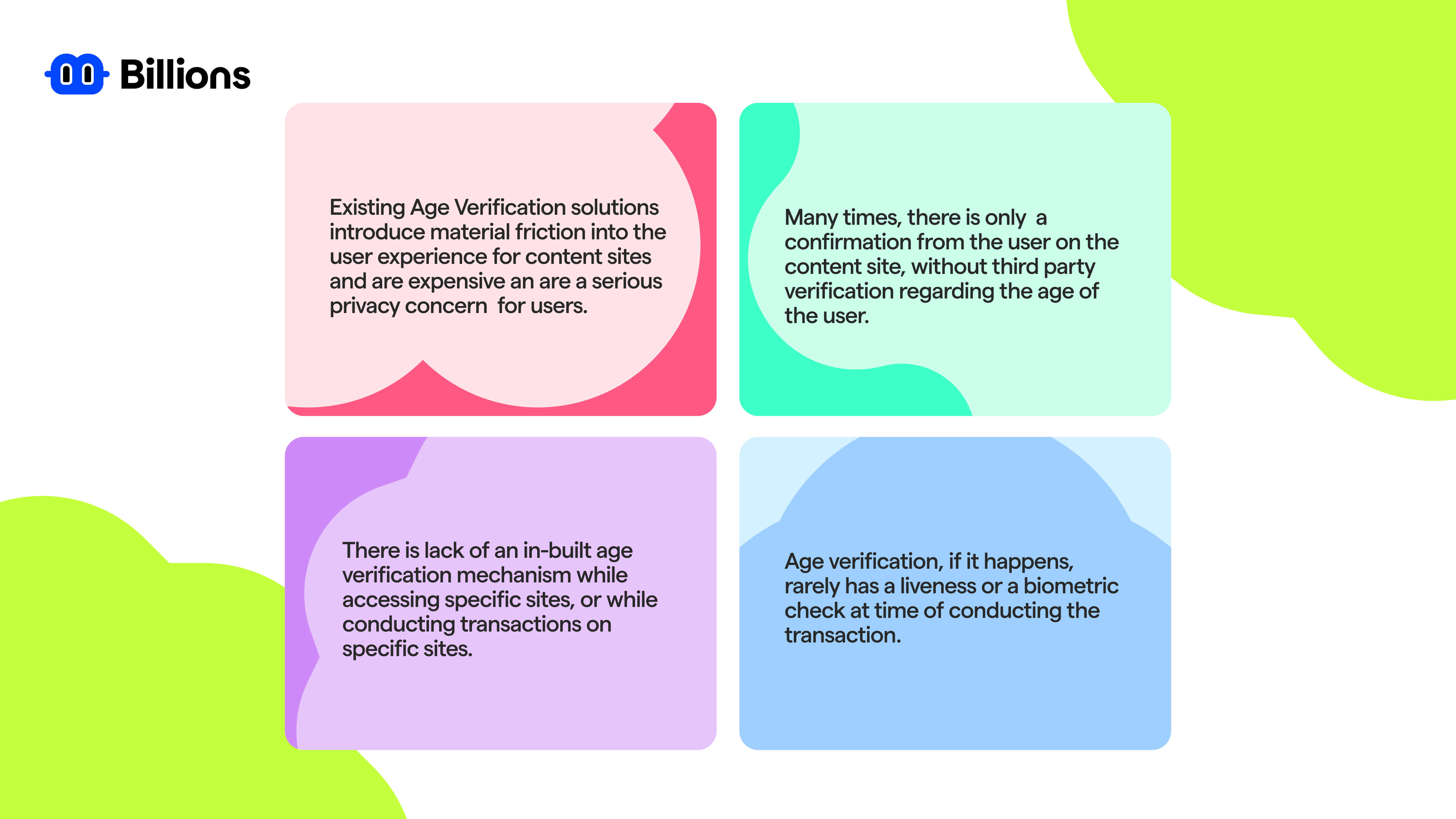 There is a rapidly evolving landscape in terms of regulations, with an increasing list of geographies opting for auditable and comprehensive age verification mechanisms. Also the growing regulations related to user and data privacy makes it mandatory for content providers to have an age verification solution. For the same reasons, it also makes sense to include age verification as an integral element of the digital Identity solution - a solution that ideally is available as a packaged solution, that can be deployed easily, reused across multiple use cases and can be seamlessly a part of the ever-increasing ecosystem of Digital Identity and its constituent participants.