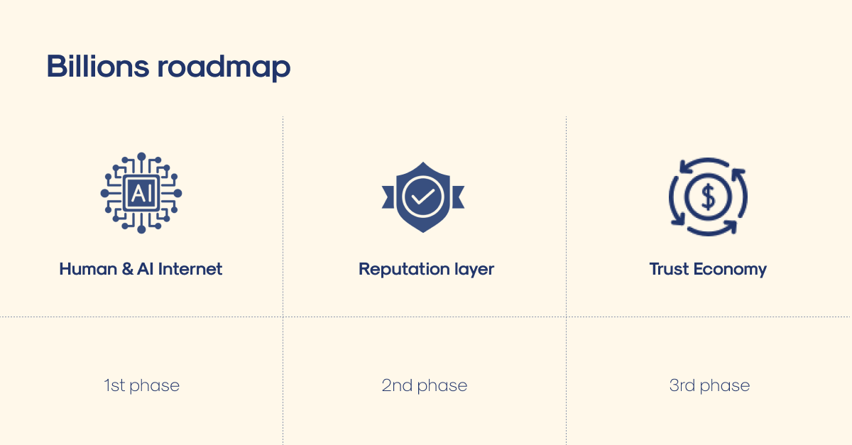 Billions는 인간과 AI가 함께하는 탈중앙 신뢰 생태계를 구축하기 위해, 단계적으로 네트워크 접근을 확대하고 있습니다. 이 생태계는 ‘가치의 인터넷(Internet of Value)’을 확장하기 위한 기반이 됩니다.