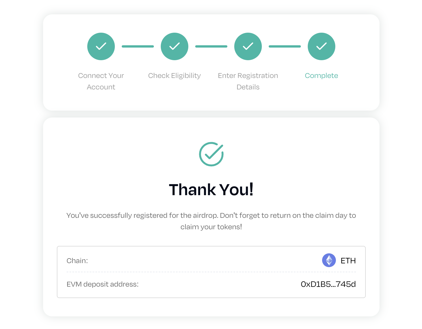 - PoU 자격증명 인증을 완료한 뒤, 사용자는 다시 등록 포털로 돌아와 ‘확인’ 버튼을 눌러 등록을 마무리했습니다.한 사람당 최초로 인증된 계정만 에어드롭 대상에 포함되었습니다.