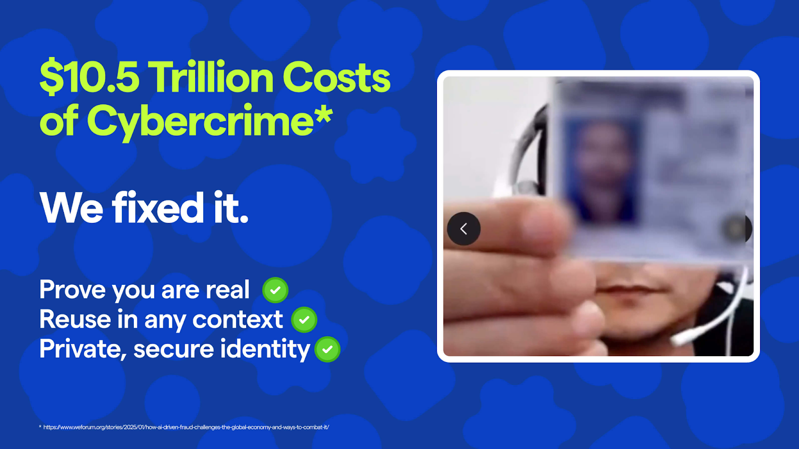 전 세계 사이버 범죄로 인한 피해 규모는 10.5조 달러에 달합니다. 우리는 실제 사용자만을 검증하고, 어디서든 다시 사용할 수 있으며,개인정보를 드러내지 않는 안전한 인증 방식을 통해 이 문제를 바꾸고 있습니다.