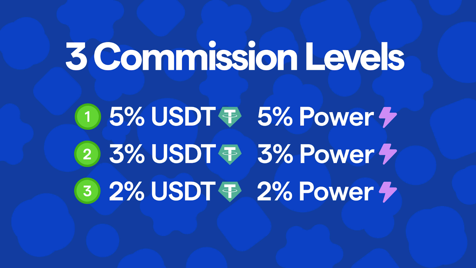 3단계 커미션 레벨 - 1) 5% USDT + 5% Power 2) 3% USDT + 3% Power 3) 2% USDT + 2% Power